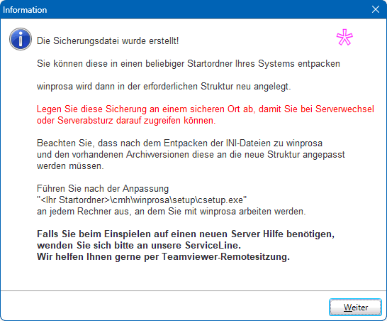 Später können Sie mittels "One-Click-Umzug" winprosa problemlos vom Programm aus komplett umziehen, z.B. auf den endgültigen Platz auf einem Server fürs Verwaltungsnetz (siehe