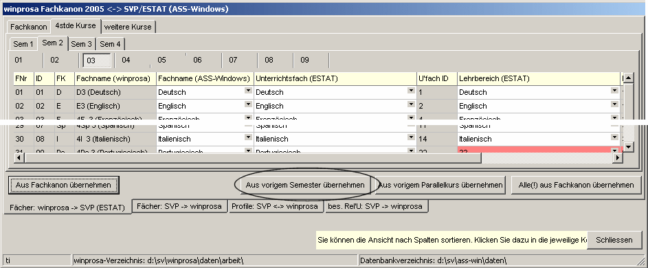 Zuletzt müssen Sie in winprosa die Fächeranpassung durchführen, wie im Kapitel 3 dieser Anleitung "Anbindung an ASS: ASS-Windows-Datenbanktyp mit ASS-Windows 2006" und dort im Unterkapitel 4 "Arbeiten in winprosa Teil II: Fächeranpassung" beschrieben ist.