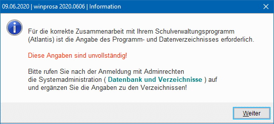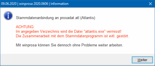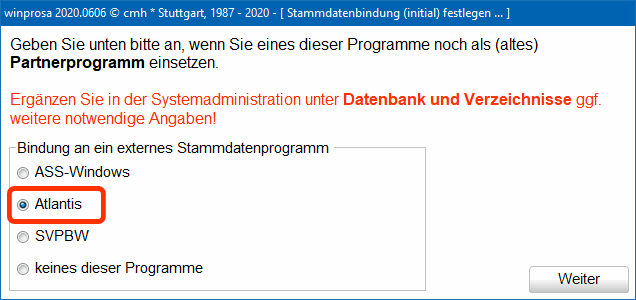 Ab Version 2020.0614 werden Sie beim ersten Programmstart anlässlich einer Neuinstallation nach alten Partnerprogrammen gefragt (s.l.u.). Wenn Sie hier Atlantis angeben, wird der entsprechende Eintrag in winprosa.ini automatisch gesetzt und Sie erhalten die Meldung, dass noch Angaben fehlen (s.r.u.).