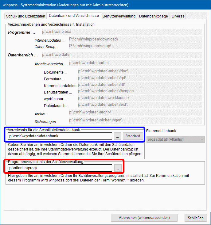 Starten Sie also in winprosa den Dienst Datei > Datenbank > Systemadministation | Datenbank und Verzeichnisse. Dort ist nun der blau/rot gekennzeichnete Bereich sichtbar (s.r.):