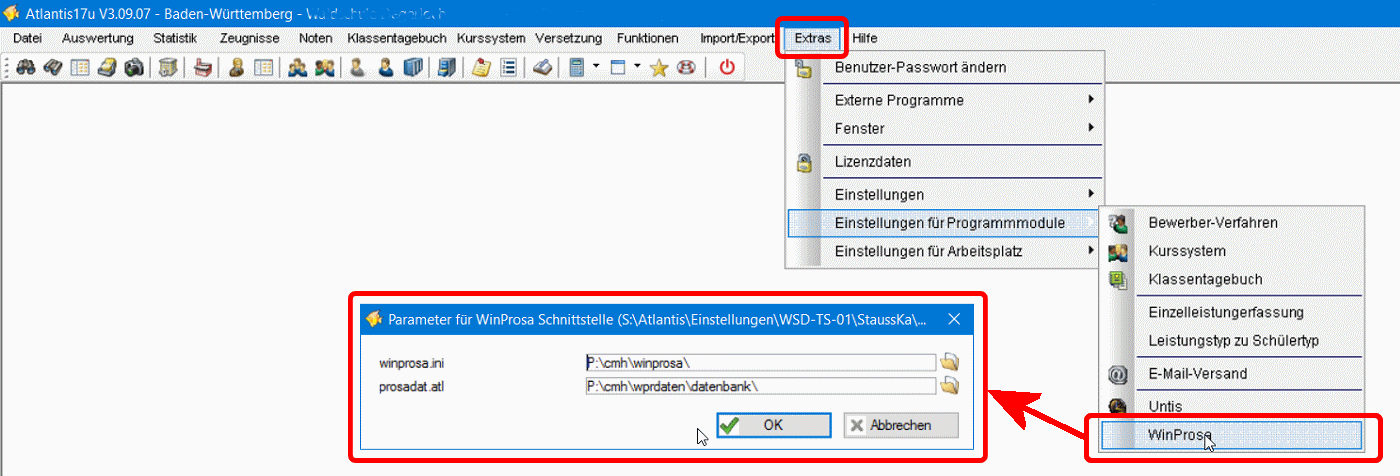 In Atlantis ist noch die alte Partnerschaft eingetragen. Sie müssen dort also ggf. im Dienst Extras > Einstellung für Programmmodule > WinProsa die neuen Wege zu winprosa aktualisieren (s.u.).