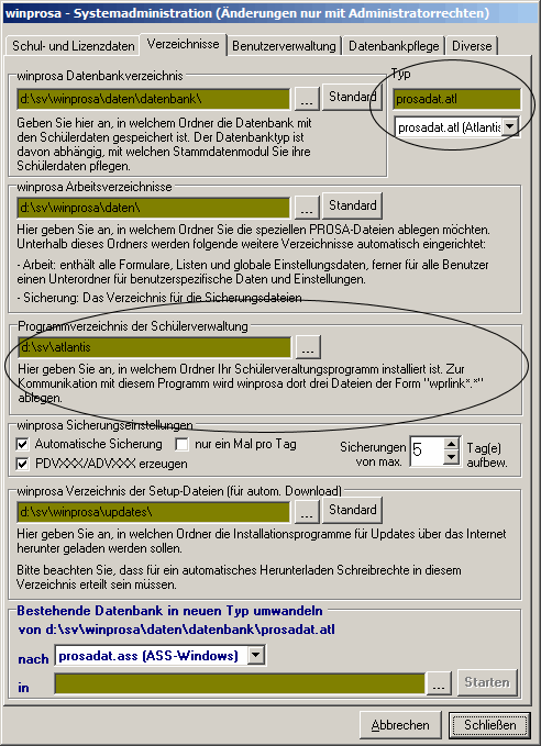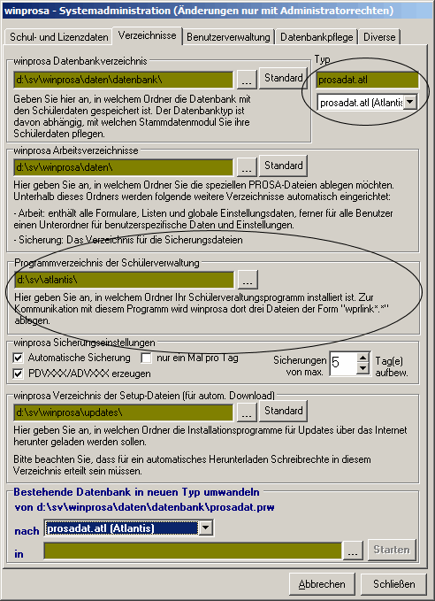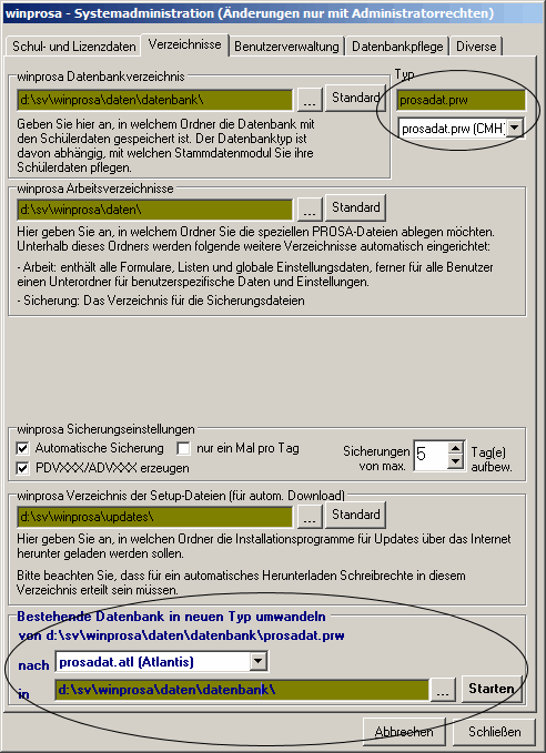 Tragen Sie unten bei Bestehende Datenbank in neuen Typ umwandeln den Typ prosadat.atl (Atlantis) ein und geben Sie darunter das winprosa-Datenbankverzeichnis an.