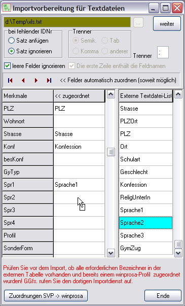Es öffnet sich das Fenster Importvorbereitung für Textdateien. Für alle externen Merkmalsnamen können Sie nun die zugehörigen internen Namen festlegen (s.r.).