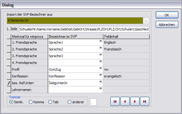 Zum automatischen Einlesen der Daten muss winprosa wissen, welche externen Merkmalsnamen zu welchen in winprosa benützen Merkmalsnamen gehören. Bsp.: