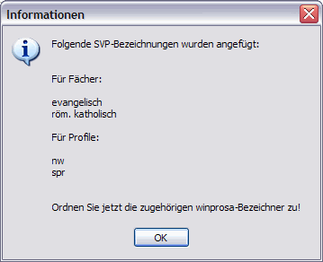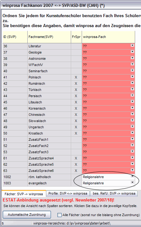 erkennen Sie die im Beispiel gefundenen (SVP-)Fächer "evangelisch" und "röm.katholisch", denen Sie nun aus der Auswahlliste jeweils die winprosa-Bezeichnung "Religionslehre" zuweisen müssen (siehe nebenstehendes Bild).