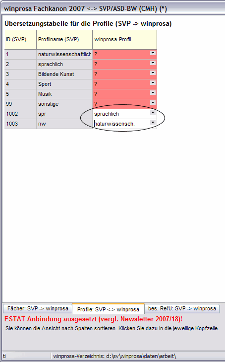 Auf der nächsten Karteikarte Profile: SVP<->winprosa bearbeiten Sie in gleicher Weise die Profile; im Beispiel sind das "spr" und "nw" (siehe nebenstehendes Bild).