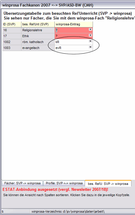 Auf der dritten Karteikarte bes. Rel'U: SVP<->winprosa müssen Sie zuletzt die Kürzel für besuchten Religionsunterricht anpassen.