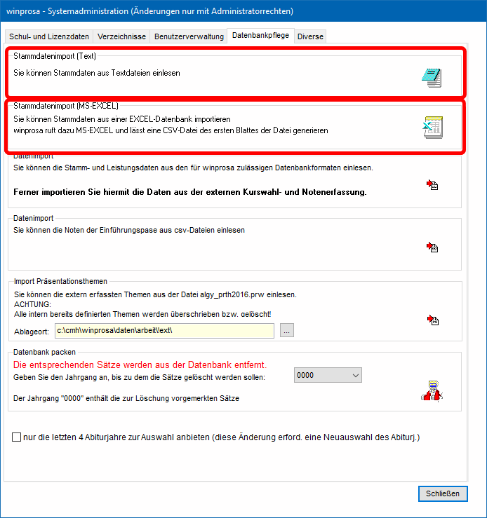 Die Datenübernahme erfolgt (mit Administratorrechten!) im Dienst Datei > Datenbank > Systemadministration auf der Karteikarte Datenbankpflege (s.r.) grundsätzlich so, wie im Handbuch ab Seite 3-7 ff beschrieben ist.