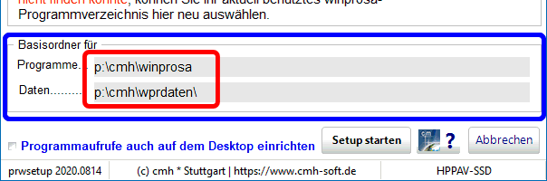P:\cmh\winprosa\winprosa.exe und bei "Ausführen in:" wird eingetragen P:\cmh\winprosa\. -