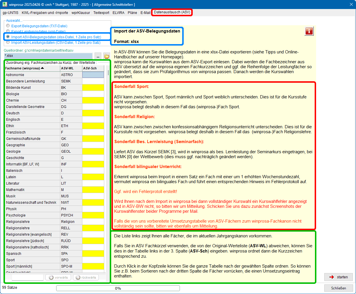 Per XLSX/CSV werden ab 2025 Kurswahl- und Leistungsdaten von ASV-BW in winprosa übernommen (s.u.; hellblau markiert).