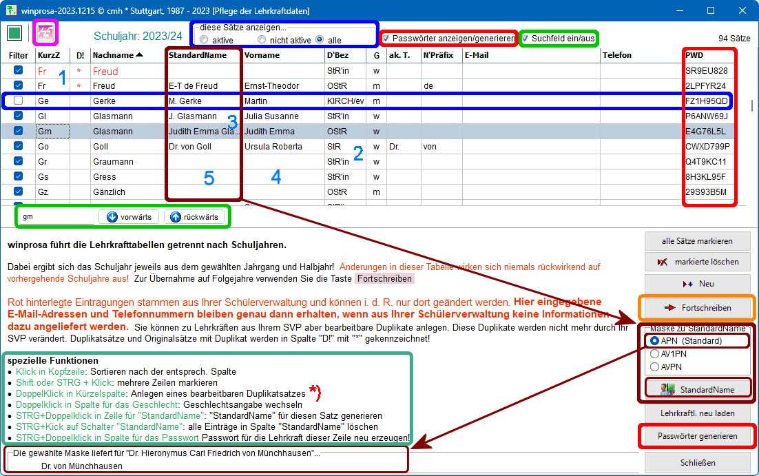 - Dadurch, das zu Beginn eines neuen winprosa-Schuljahres die Vorgängertabelle automatisch übernommen wird, wächst diese von Jahr zu Jahr automatisch an, mindestens um die neuen und die ausgeschiedenen Lehrkräfte.