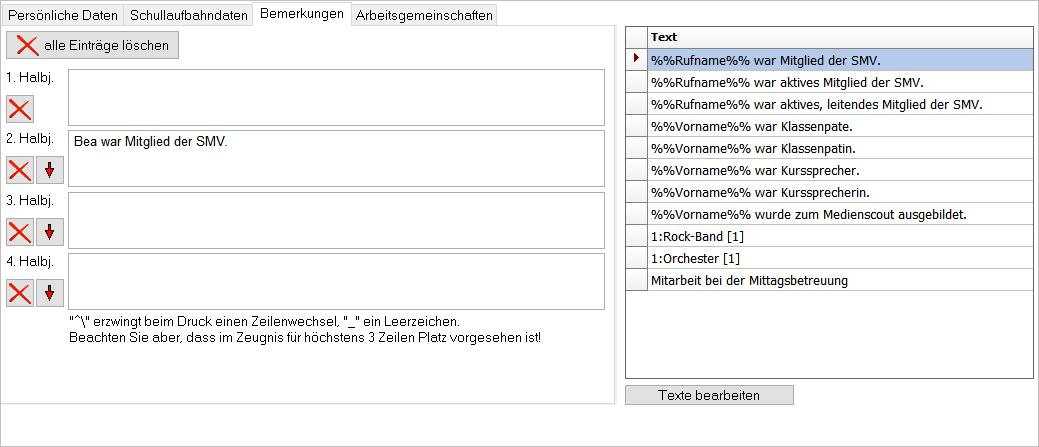 Schullaufbahndaten angeordnet (s.r.o.; blau markiert). Die beiden anderen Unterregisterkarten Bemerkungen und Arbeitsgemeinschaften sind nur aus historischen Gründen hier aufgeführt, sie sind auch im Hauptregister unter Bemerk. und AGs zu finden.