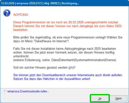 Zwei Wochen vor Eintritt des Programmverfallsdatums erscheinen daher bei jedem Programmstart entsprechende Warnhinweise. Nun steht also ein Update an. Dumm ist dann, wenn eine Schule in diesem Zeitraum mehrere Wochen lang nicht mit winprosa arbeitet und das Programmverfallsdatum greift. Wenn dann beim nächsten Start das Programmende angezeigt wird, müssen Sie sofort updaten. Sie können aber über Hilfe > über … jederzeit nachsehen, welche aktuelle Laufzeit/Verfallsdatum u.a. gelten (s.r.).